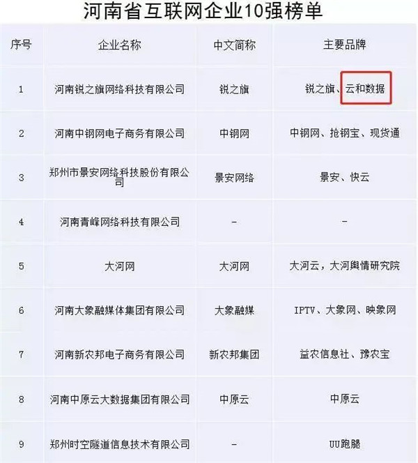 云和数据作为河南锐之旗网络科技有限公司重要品牌荣登河南省互联网企业10强榜。