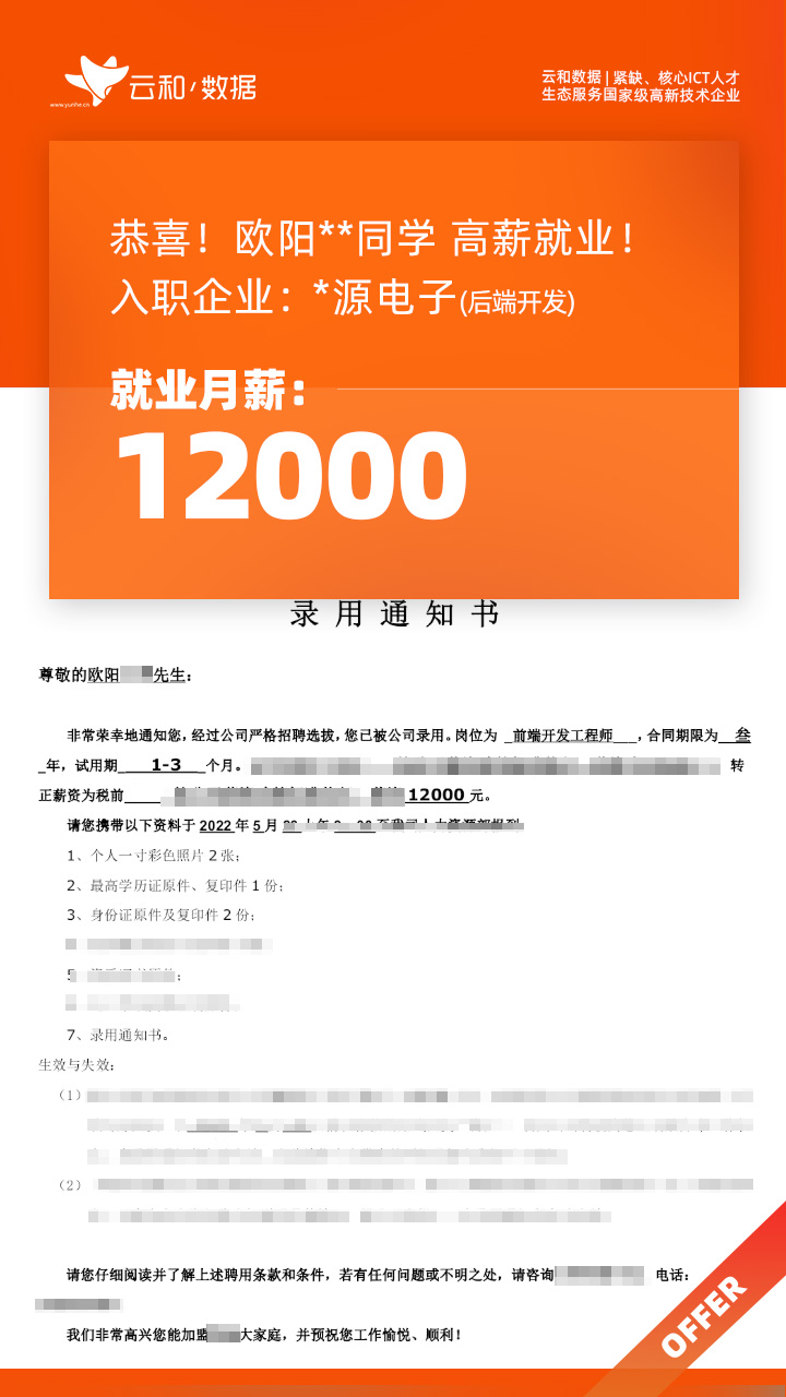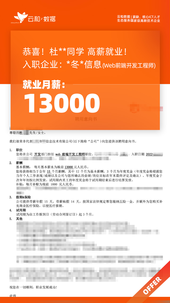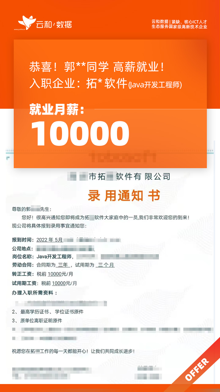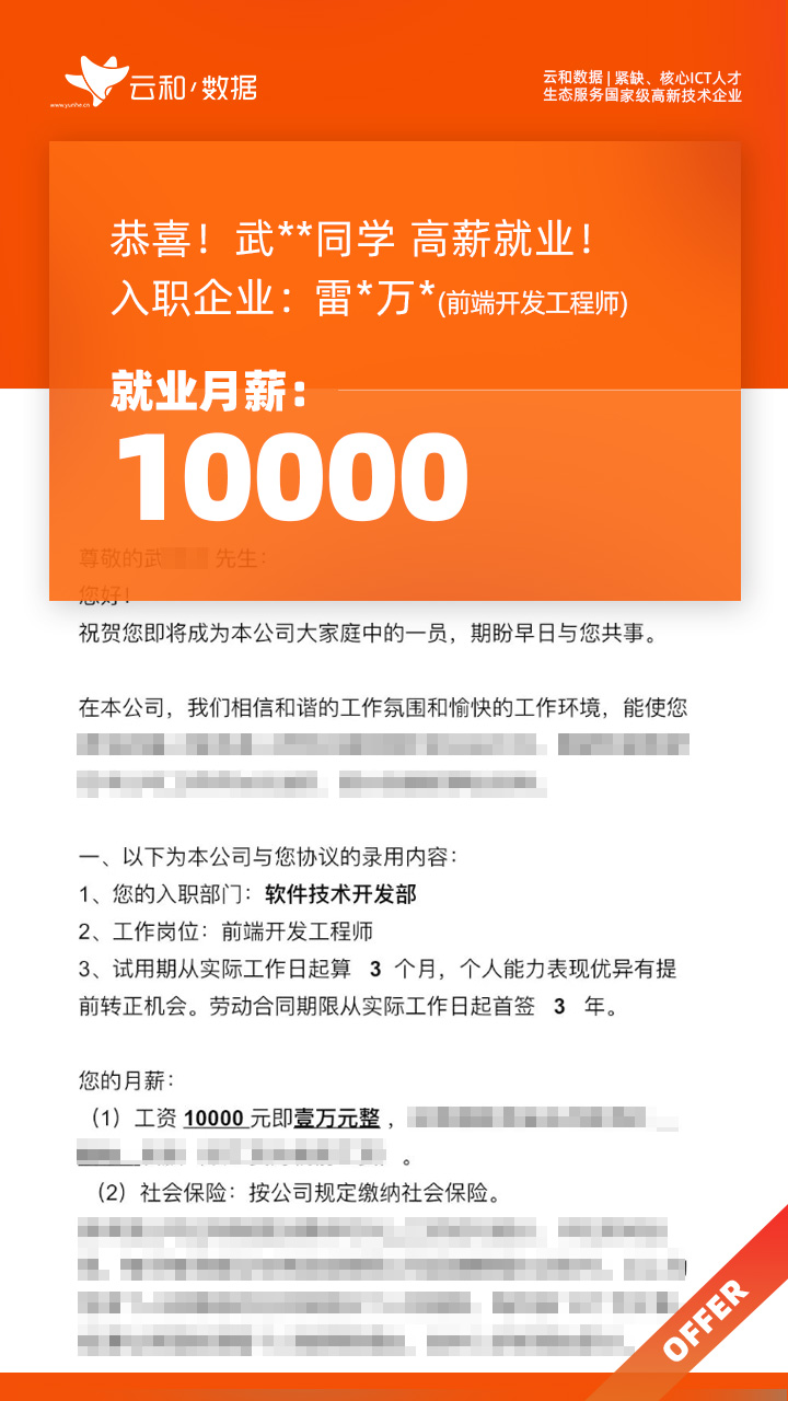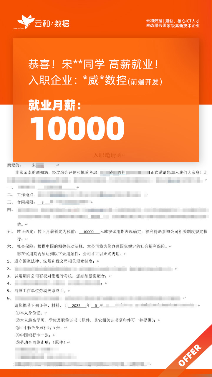 云和数据ICT职业教育发挥公司产业化优势与技术积淀,整合国内外优秀师资,累计自主研发140余项教辅、教材,115项实践教学实训平台,采用六位一体项目制教学模式,年培养高端ICT技术人才超10000人,其中线下ICT职业教育5500余人,累计为企业输送高端泛ICT技术人才超8万人,60%来自于口碑推荐。更大规模、更多人选择;更好的ICT学习、更好的就业。云和数据人才培养技术方向涵盖大数据、云计算、人工智能虚拟现实JAVA软件工程UI用户体验设计Web前端开发网络安全八大方向,云和数据以八大精品课程为基础,八大就业基地为依托,一次就业率99.02%,61.9%就业薪资超1W,以大数据为首的精品专业平均薪资13.25K。