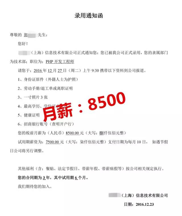 从云和毕业后,郭童鞋在就业老师的带领下很快在上海拿到了一家公司的入职OFFER,成了一位月薪8500元的 PHP 开发工程师。对于这份工作,他十分满意,并始终感激老师们的培养和帮助。重感情的他毕业后也和老师们保持联系。对于他来说,不只使他重新选择了人生,还收获了一份宝贵的师生情。